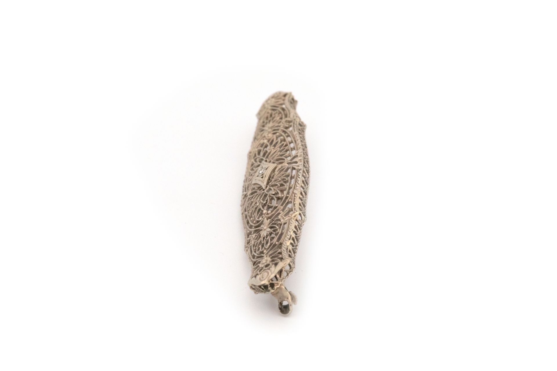 This exquisite filigree brooch beautifully highlights a floral-inspired design, adorned with intricate millgrain detailing and radiant cuts encircling the entire piece. At its heart lies a stunning round diamond, adding a touch of elegance to the brooch.