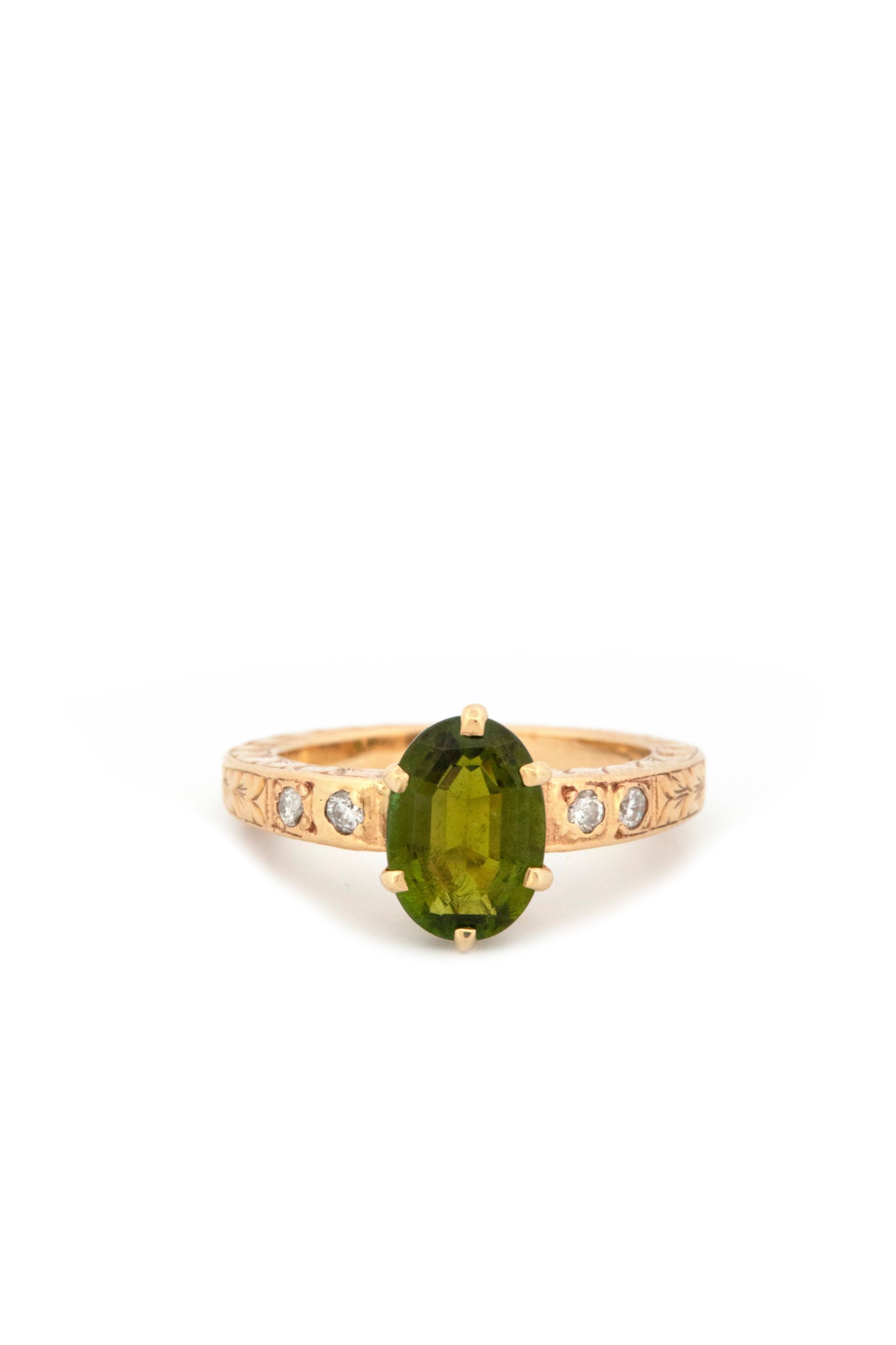 This beautiful 14k yellow gold ring shows off a lovely olive green color green Tourmaline oval as the center stone encased in a 6 prong basket setting with 4 round diamonds flush set into the shank, 2 on each side of the center stone. The shank features fine engraving in a "wheat" style pattern.