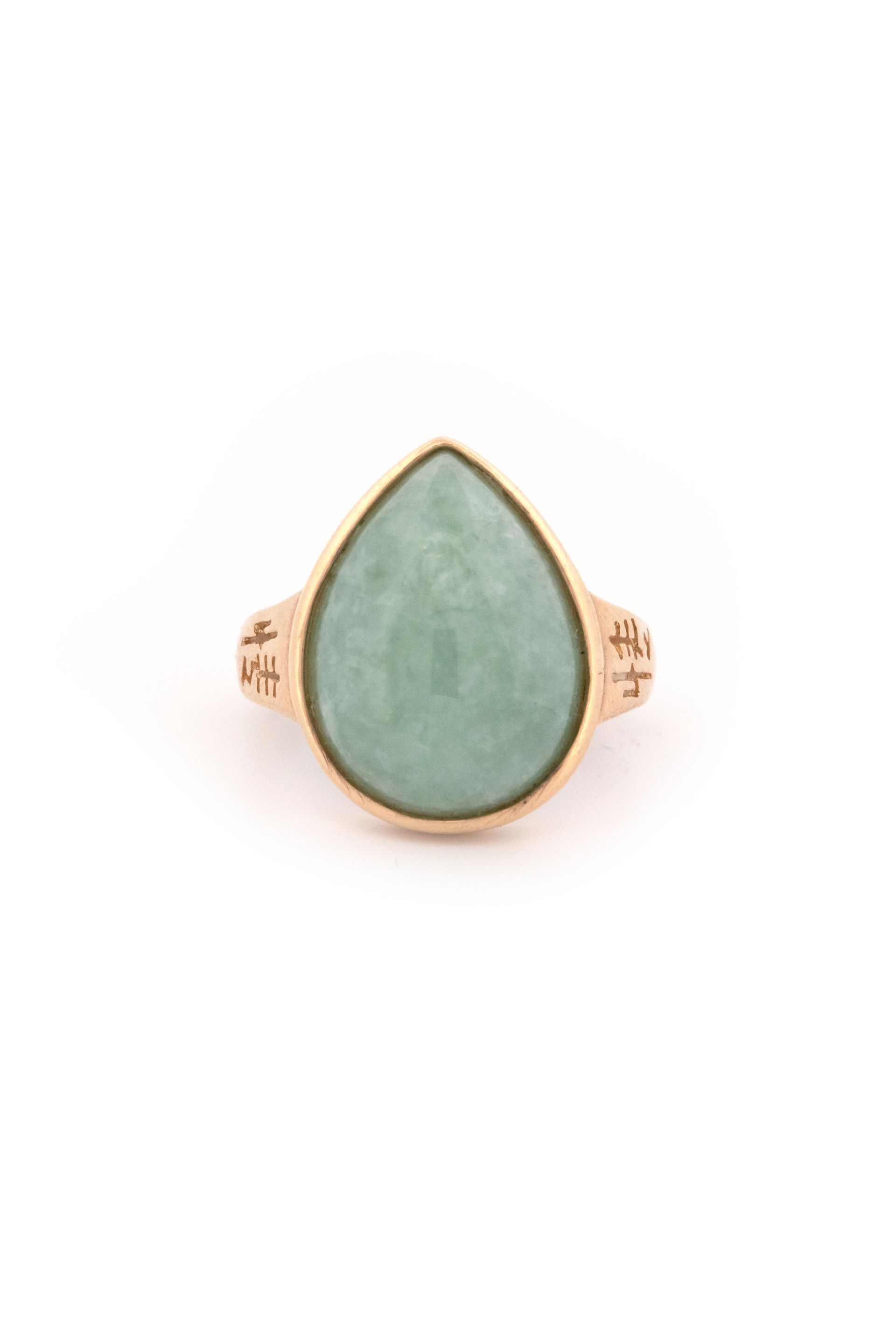 A 14k yellow gold and pear cut Jadeite ring with cut out "characters" on the shoulders. Set in a bezel on a tapered shank.