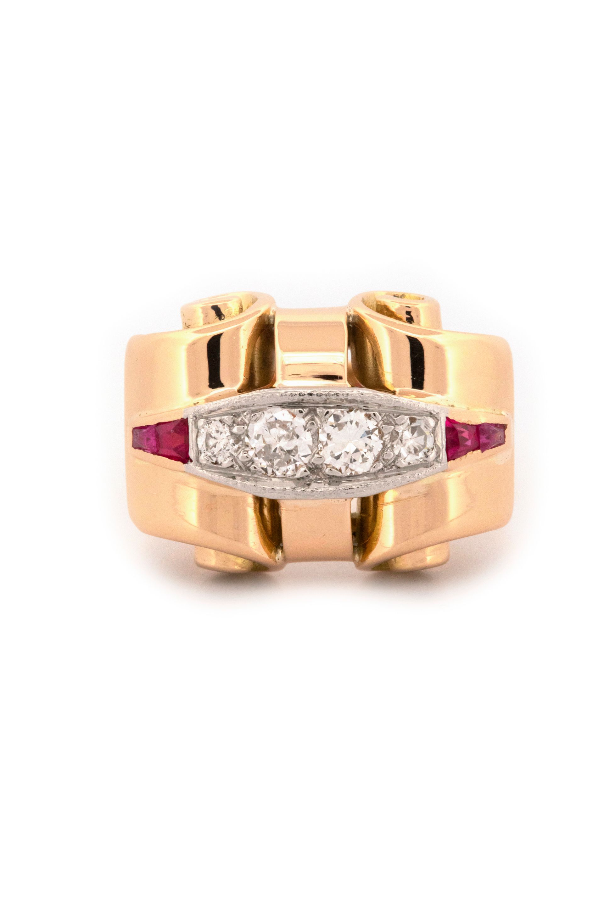 This unique 14k Yellow Gold ring is in a scroll style setting with 4 diamonds in the center accented with 4 tapered baguette rubies.