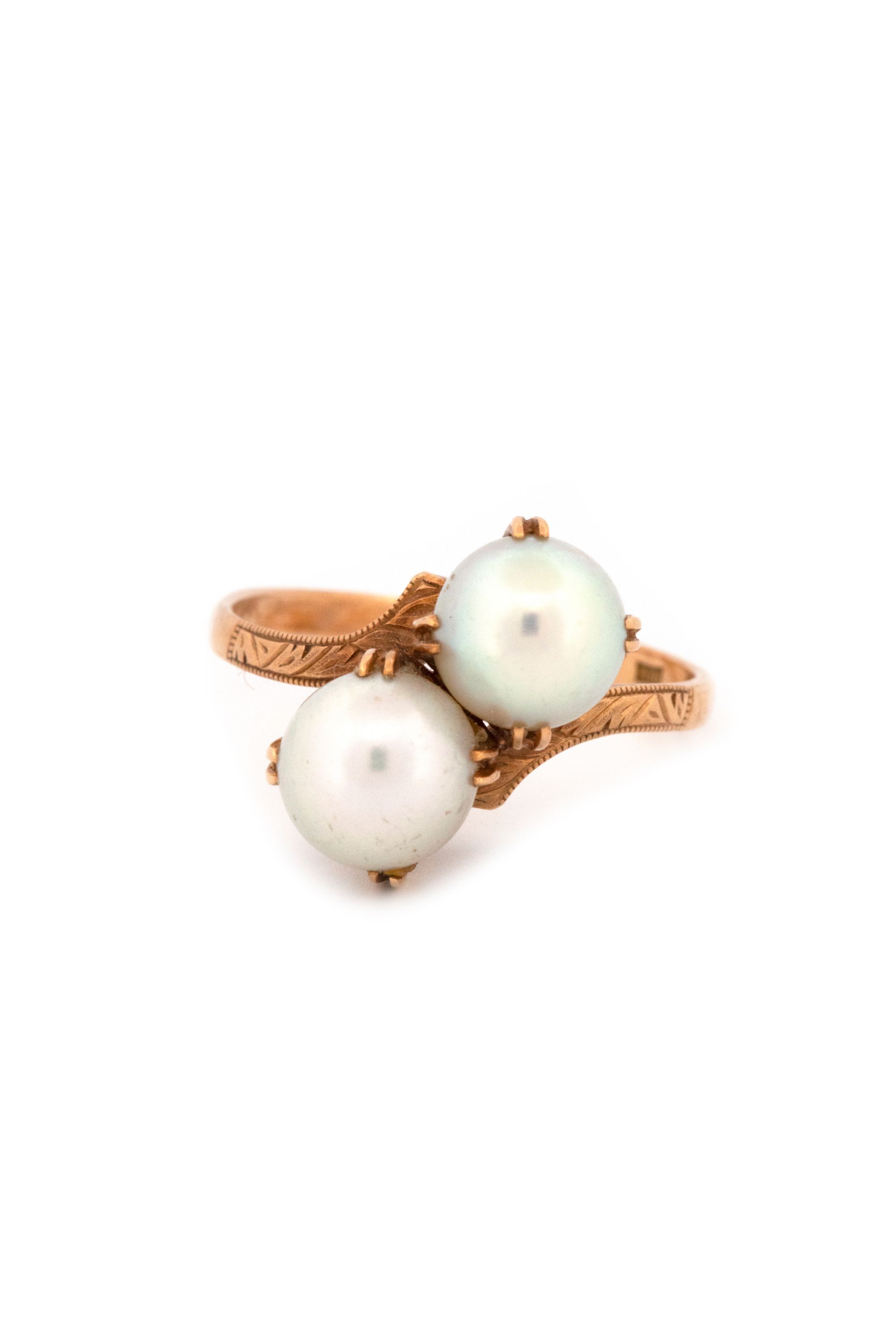 18k Yellow Gold Two Pearl Ring with Engraved Shank