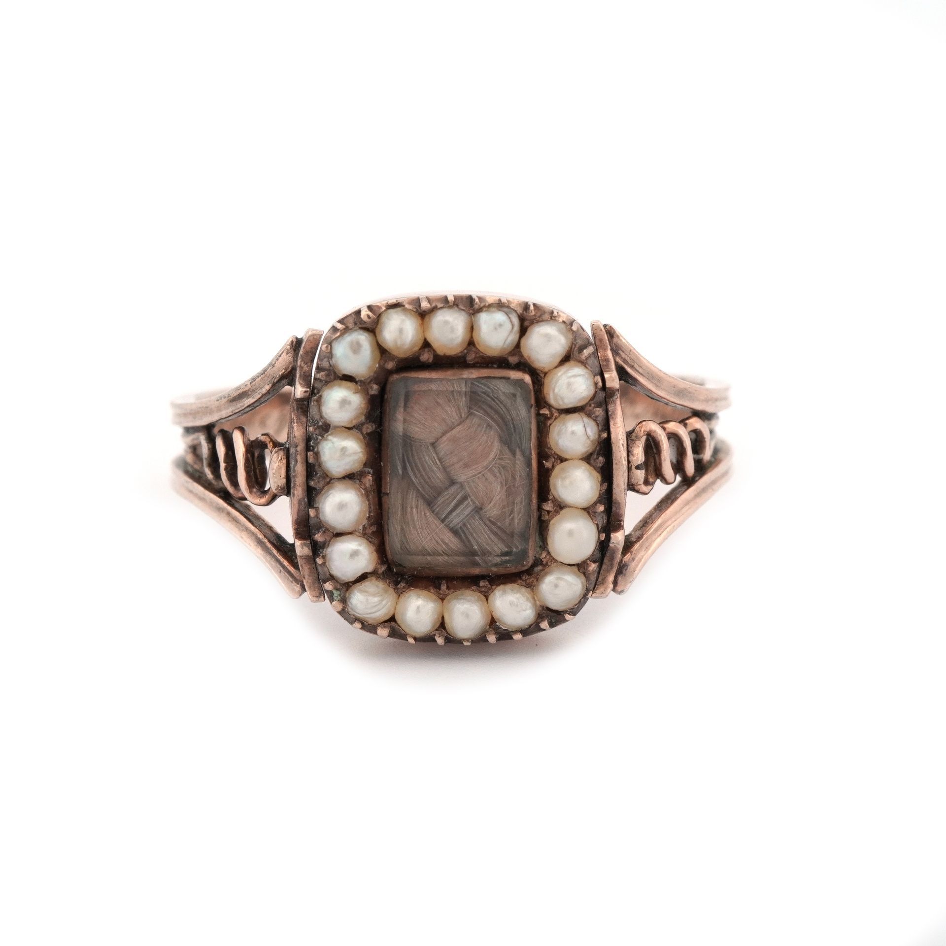 This antique ring is a form of jewelry called a mourning ring, which typically contains a piece of hair from the person who had passed on. This ring in particular is special due to the flipable center setting, on one side, a clear picture cut piece of stone or glass holding in the hair with a halo of 18 small seed pearls, its flips over to reveal a hand carved snake eating its tail in 9kt yellow gold wrapped around a black enamel inscription "Telos Goord Binov 1819, AE163" and the shank is engraved on the inside with "Tybelley, Ob25, June 1821, R. 10 Months"