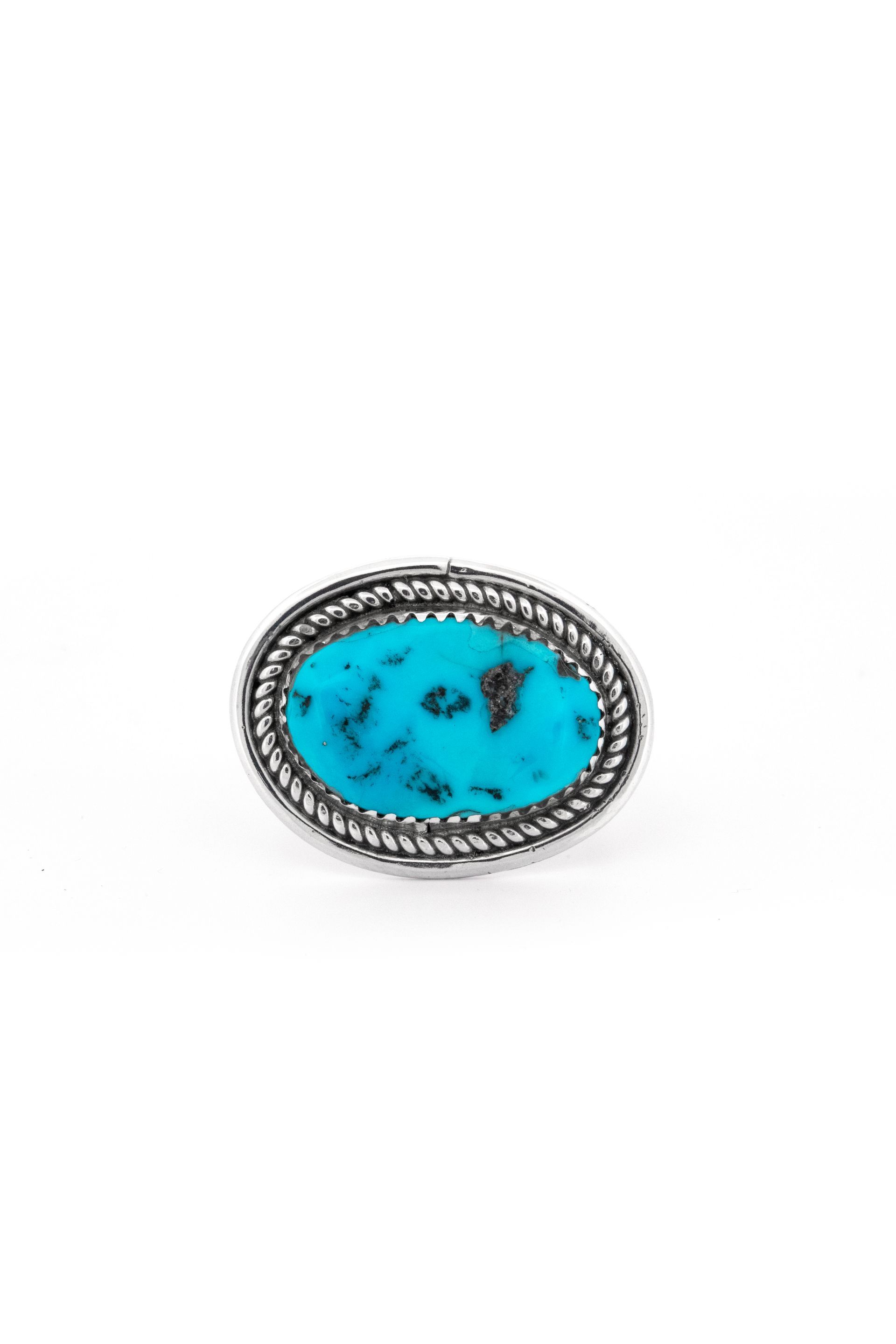 Freeform oval cabochon with a "natural top" the stonecutter cut this turquoise to where is has curves on the top somewhat following its natural form, bezel set in sterling silver and ordained with a twist wire and lip around the bezel with a split shank.