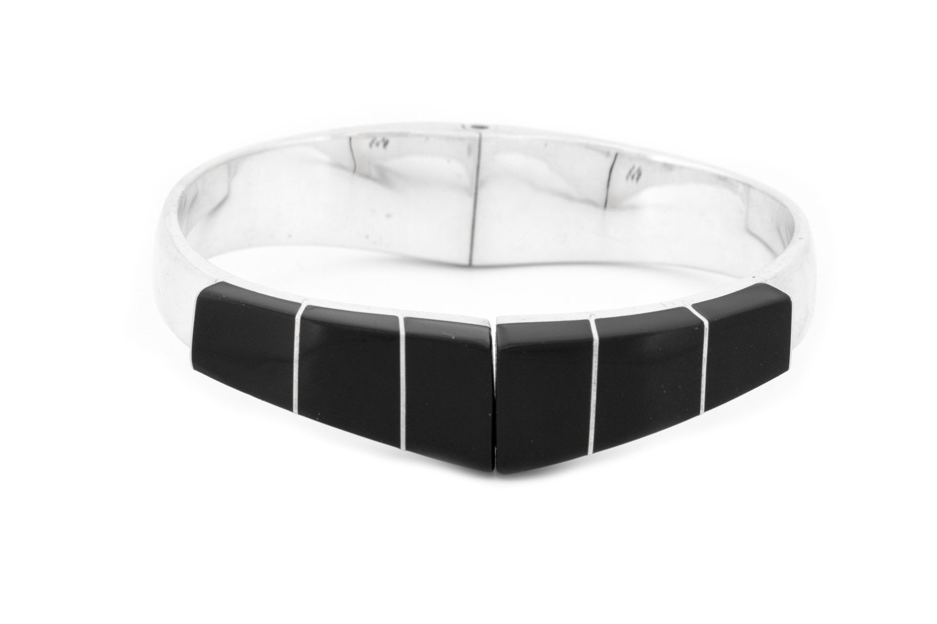 This hinged cuff with a graduated black onyx inlay with silver in between each stone is on a hinged cuff for ease of putting on.