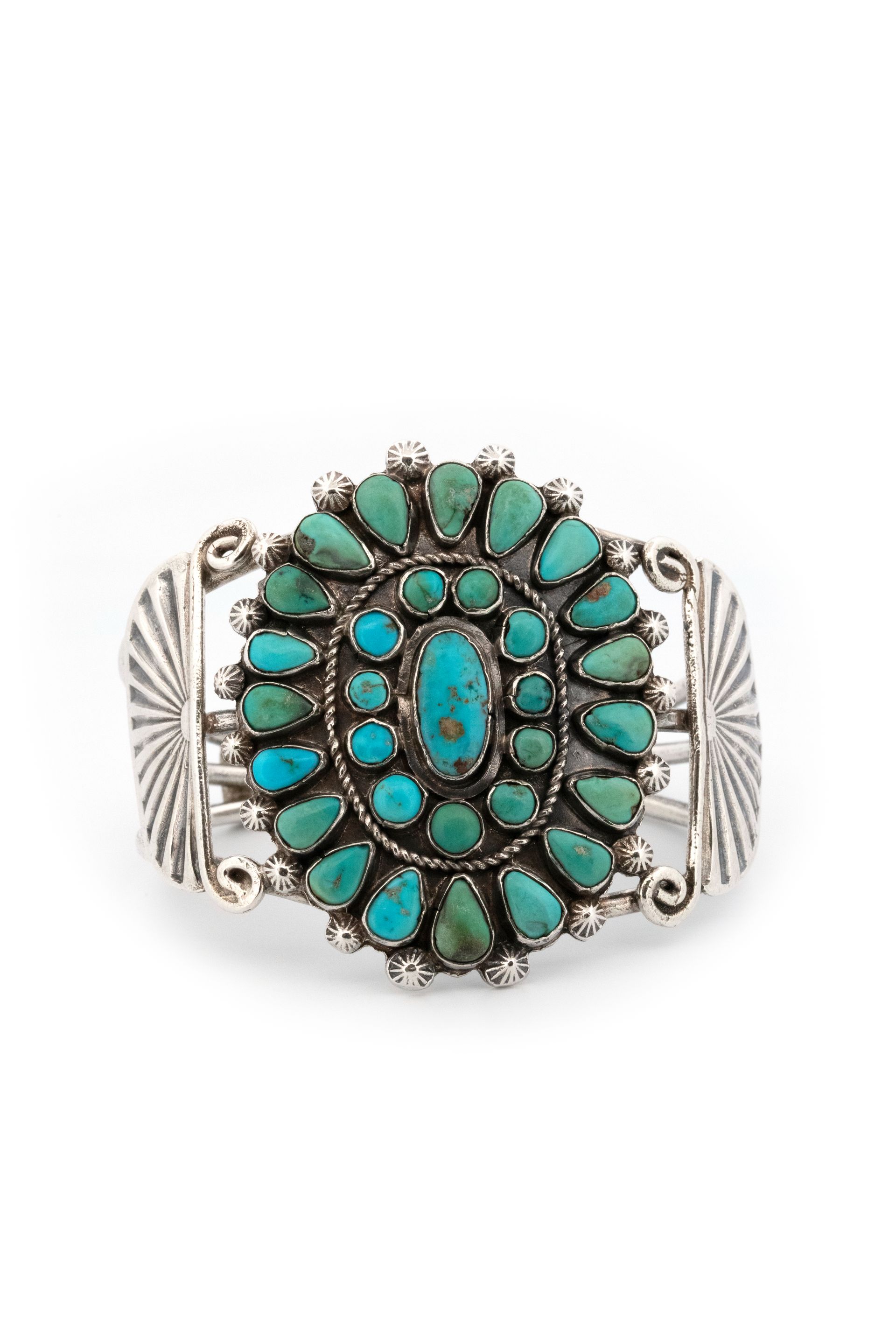 Petit Point silver bracelet cuff with oval center stone and halo of round and pear cut cabochons. "scalloped" stamped design in silver on the sides of the cuff.